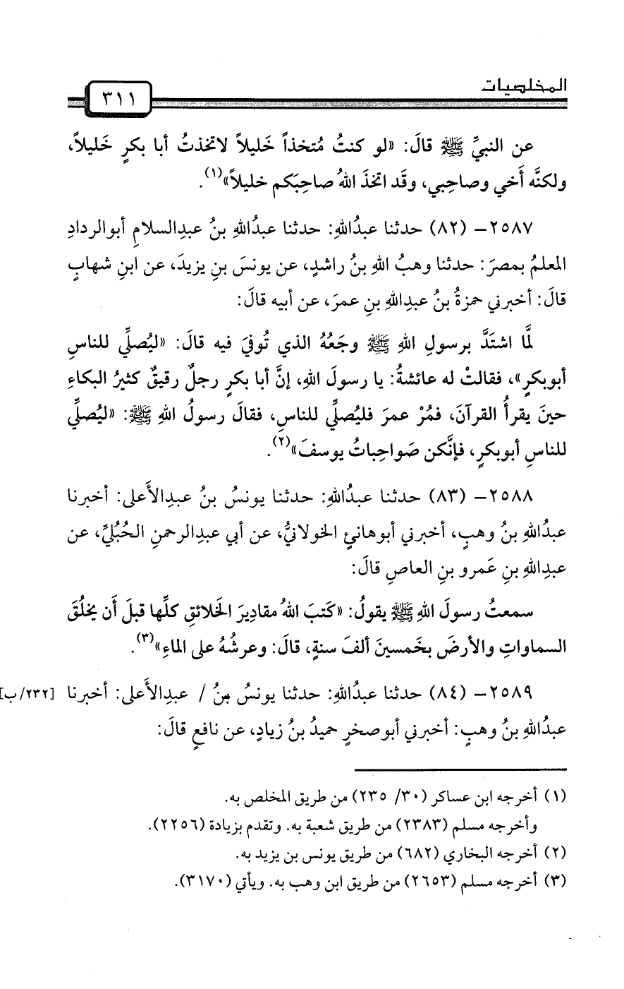 2589- (84) حدثنا عبدُاللهِ: حدثنا يونسُ بنُ / عبدِالأَعلى: أخبرنا عبدُاللهِ بنُ وهبٍ: أخبرني أبوصخرٍ حميدُ بنُ زيادٍ، عن نافعٍ قالَ:
