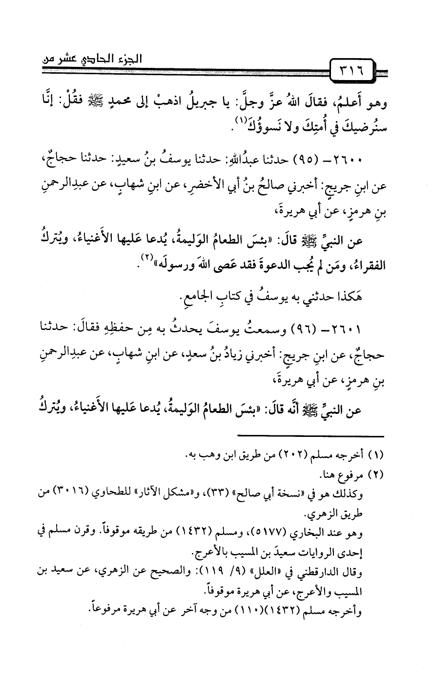 2601- (96) وسمعتُ يوسفَ يحدثُ به مِن حفظِهِ فقالَ: حدثنا حجاجٌ، عن ابنِ جريجٍ: أخبرني زيادُ بنُ سعدٍ، عن ابنِ شهابٍ، عن عبدِالرحمنِ بنِ هرمزٍ، عن أبي هريرةَ،