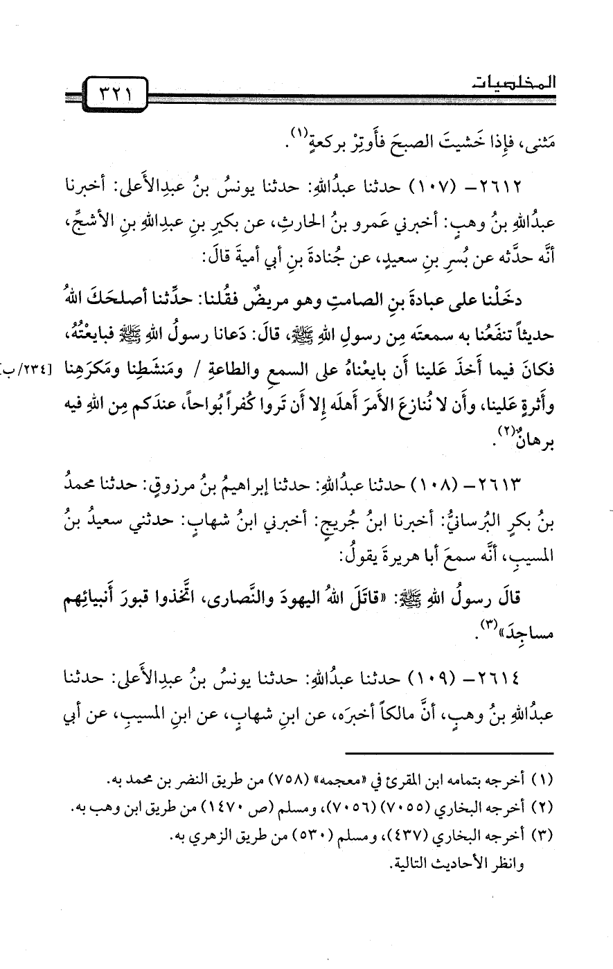2612- (107) حدثنا عبدُاللهِ: حدثنا يونسُ بنُ عبدِالأَعلى: أخبرنا عبدُاللهِ بنُ وهبٍ: أخبرني عَمرو بنُ الحارثِ، عن بكيرِ بنِ عبدِاللهِ بنِ الأشجِّ، أنَّه حدَّثه عن بُسرِ بنِ سعيدٍ، عن جُنادةَ بنِ أبي أميةَ قالَ: