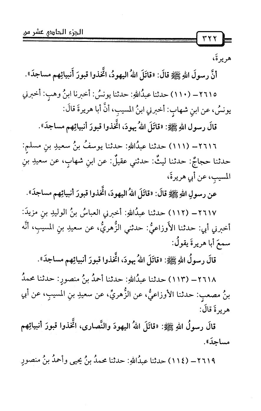 عن رسولِ اللهِ صلى الله عليه وسلم قالَ: «قاتَلَ اللهُ اليهودَ، اتَّخذوا قبورَ أنبيائِهم مساجدَ» .