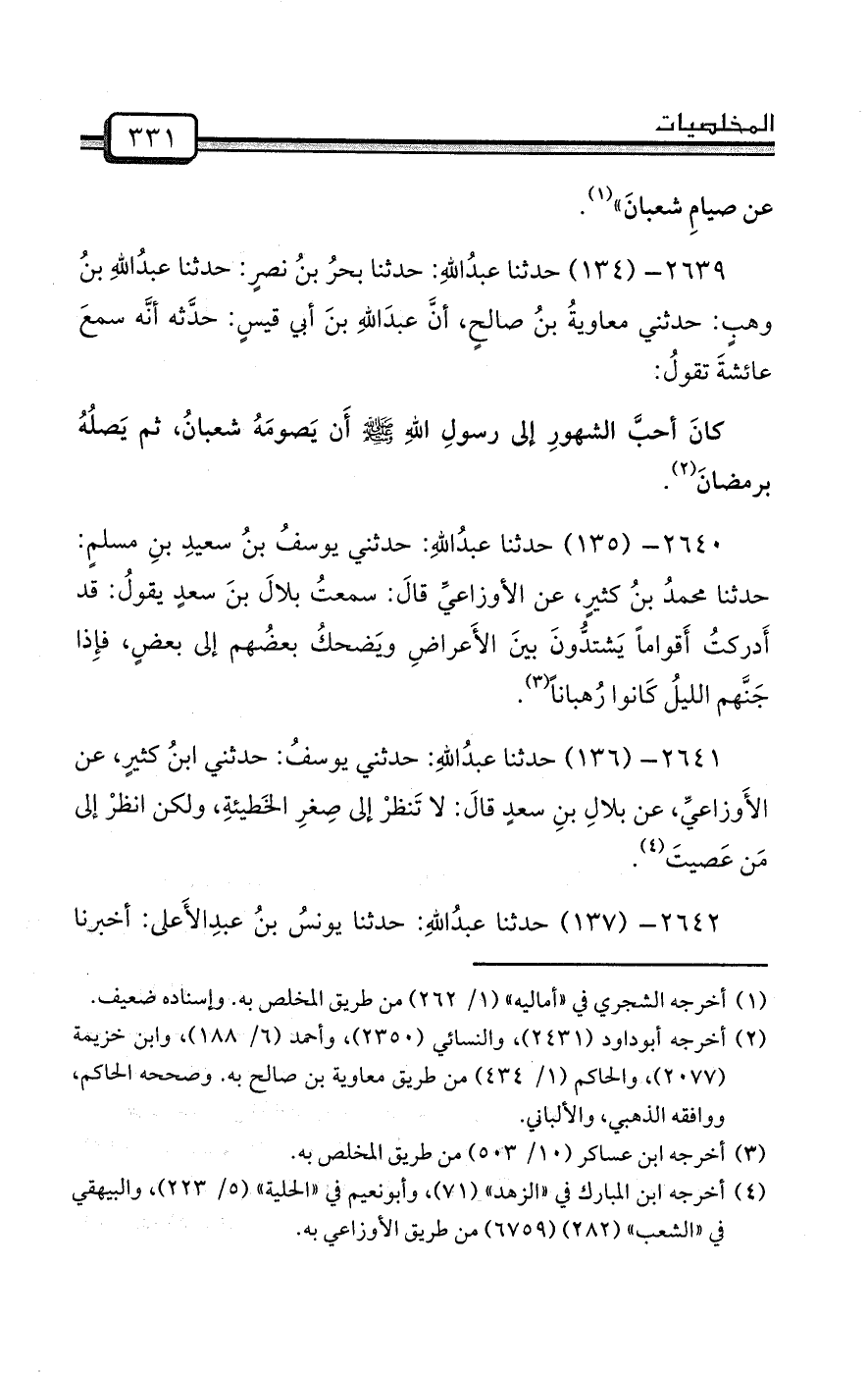 2640- (135) حدثنا عبدُاللهِ: حدثني يوسفُ بنُ سعيدِ بنِ مسلمٍ: حدثنا محمدُ بنُ كثيرٍ، عن الأوزاعيِّ قالَ: سمعتُ بلالَ بنَ سعدٍ يقولُ: قد أَدركتُ أَقواماً يَشتدُّونَ بينَ الأَعراضِ ويَضحكُ بعضُهم إلى بعضٍ، فإِذا جَنَّهم الليلُ كَانوا رُهباناً (¬3) .