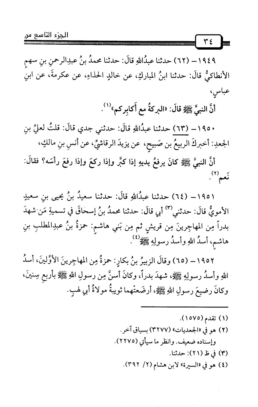 1951- (64) حدثنا عبدُاللهِ قالَ: حدثنا سعيدُ بنُ يحيى بنِ سعيدٍ الأمويُّ قالَ: حدثني (¬3) أبي قالَ: حدثنا محمدُ بنُ إسحاقَ في تسميةِ مَن شهدَ بدراً مِن المهاجِرينَ مِن قريشٍ ثم مِن بَني هاشمٍ: حمزةُ بنُ عبدِالمطلبِ بنِ هاشمٍ، أسدُ اللهِ وأسدُ رسولِهِ صلى الله عليه وسلم (¬4) .