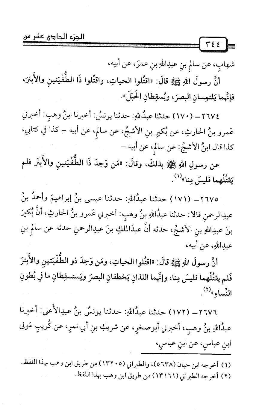 أنَّ رسولَ اللهِ صلى الله عليه وسلم قالَ: «اقتُلوا الحياتِ، ومَن وَجدَ ذو الطُّفْيَتينِ والأَبترَ فَلم يقتُلْهما فليسَ مِنا، وإنَّهما اللذانِ يَخطفانِ البصرَ ويَستسقِطانِ ما في بُطونِ النِّساءِ» (¬2) .