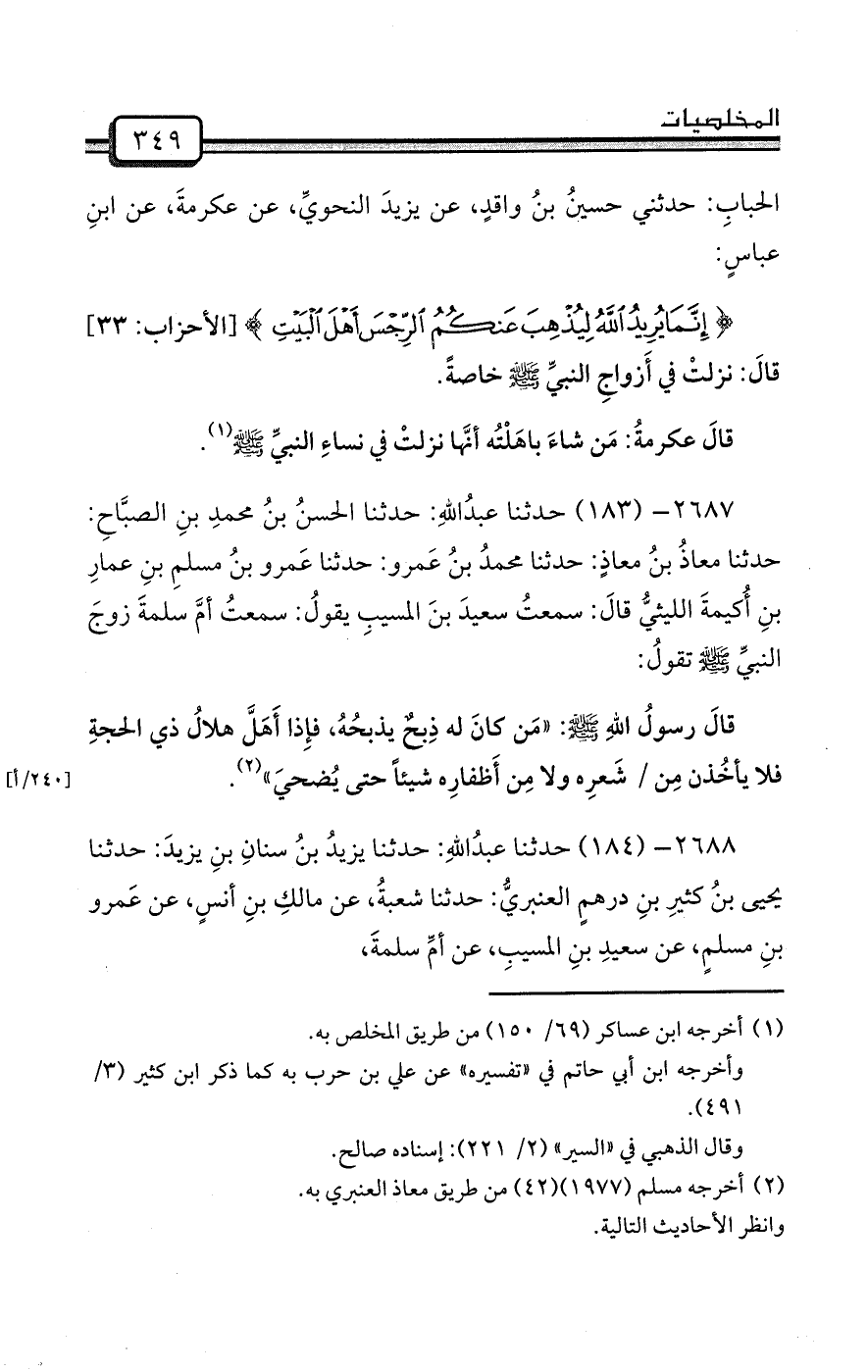 2688- (184) حدثنا عبدُاللهِ: حدثنا يزيدُ بنُ سنانِ بنِ يزيدَ: حدثنا يحيى بنُ كثيرِ بنِ درهمٍ العنبريُّ: حدثنا شعبةُ، عن مالكِ بنِ أنسٍ، عن عَمرو بنِ مسلمٍ، عن سعيدِ بنِ المسيبِ، عن أمِّ سلمةَ،