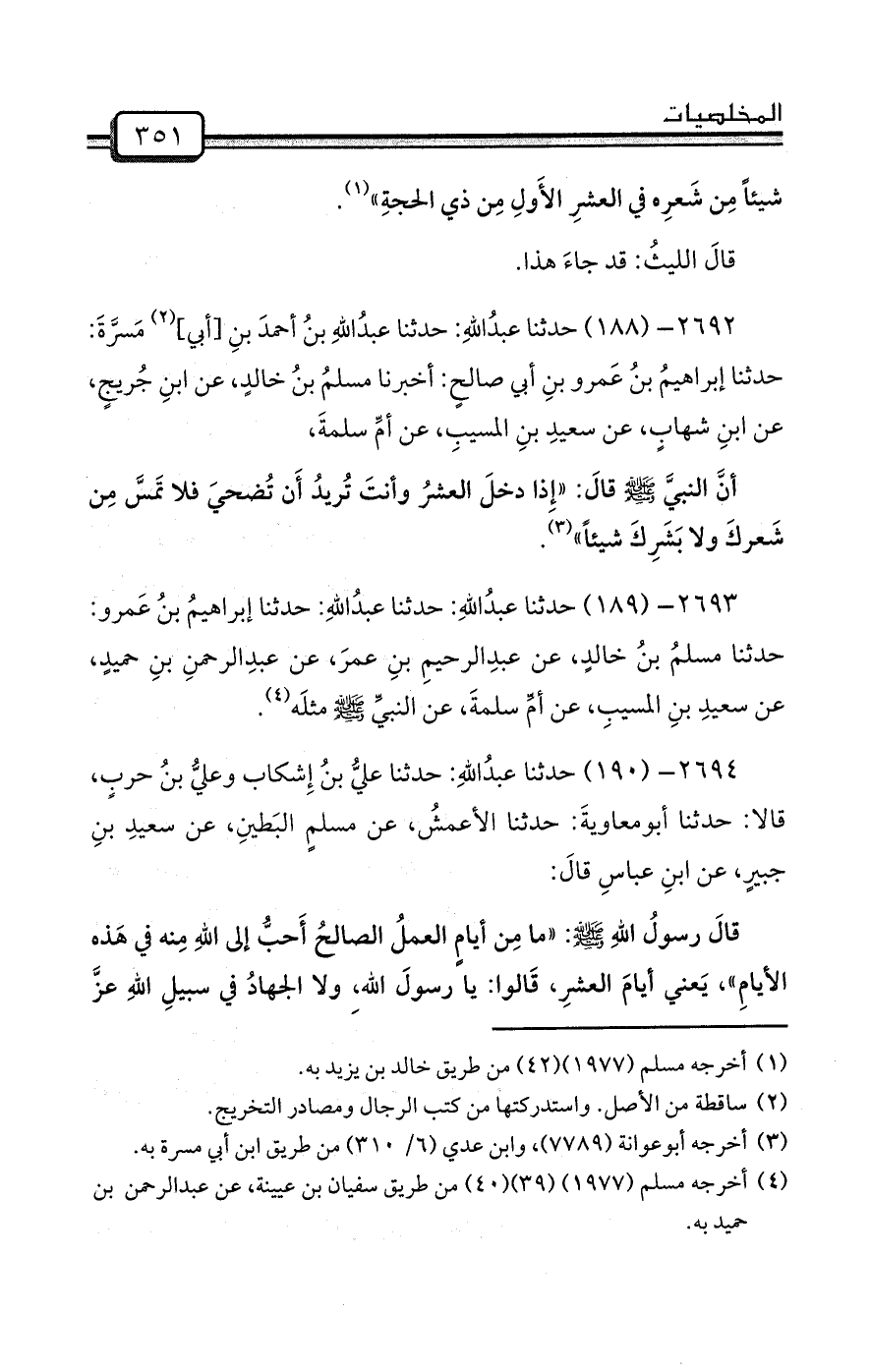 2693- (189) حدثنا عبدُاللهِ: حدثنا عبدُاللهِ: حدثنا إبراهيمُ بنُ عَمرو: حدثنا مسلمُ بنُ خالدٍ، عن عبدِالرحيمِ بنِ عمرَ، عن عبدِالرحمنِ بنِ حميدٍ، عن سعيدِ بنِ المسيبِ، عن أمِّ سلمةَ، عن النبيِّ صلى الله عليه وسلم مثلَه (¬4) .