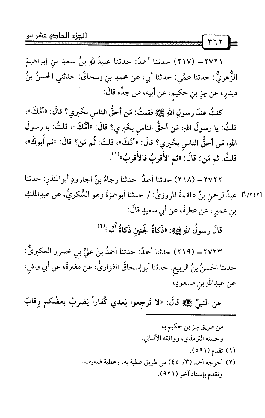 كنتُ عندَ رسولِ اللهِ صلى الله عليه وسلم فقلتُ: مَن أحقُّ الناسِ بخَيري؟ قالَ: «أمُّكَ» ، قلتُ: يا رسولَ اللهِ، مَن أحقُّ الناسِ بخَيري؟ قالَ: «أمُّكَ» ، قلتُ: يا رسولَ اللهِ، مَن أحقُّ الناسِ بخَيري؟ قالَ: «أمُّكَ» ، قلتُ: ثُم مَن؟ قالَ: «ثم أَبوكَ» ، قلتُ: ثم مَن؟ قالَ: «ثم الأَقربُ فالأَقربُ» (¬1) .