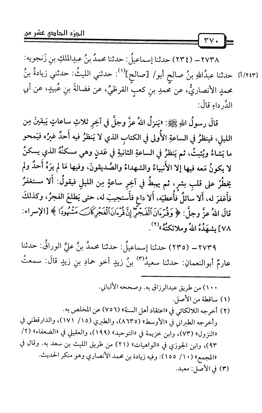 قالَ رسولُ اللهِ صلى الله عليه وسلم: «يَنزلُ اللهُ عزَّ وجلَّ في آخِرِ ثلاثِ ساعاتٍ يَبقينَ مِن الليلِ، فينظرُ في الساعةِ الأُولى في الكتابِ الذي لا يَنظرُ فيه أَحدٌ غيرُه فيَمحو ما يَشاءُ ويُثبتُ، ثم يَنظرُ في الساعةِ الثانيةِ في عَدنٍ وهي مسكنُهُ الذي يسكنُ لا يكونُ مَعه فيها إلا الأَنبياءُ والشهداءُ والصِّديقونَ، وفيها مَا لم يرَهُ أَحدٌ ولم يخطُرْ على قلبِ بشرٍ، ثم يهبطُ في آخِرِ ساعةٍ مِن الليلِ فيقولُ: أَلا مستغفرٌ فأَغفرَ له، أَلا سائلٌ فأُعطيَه، أَلا داعٍ فأَستجيبَ له، حتى يَطلعَ الفجرُ، وكذلكَ قالَ اللهُ عزَّ وجلَّ: {وَقُرْآنَ الْفَجْرِ إِنَّ قُرْآنَ الْفَجْرِ كَانَ مَشْهُودًا} [الإسراء: 78] يشهَدُهُ اللهُ وملائكتُهُ» (¬2) .
