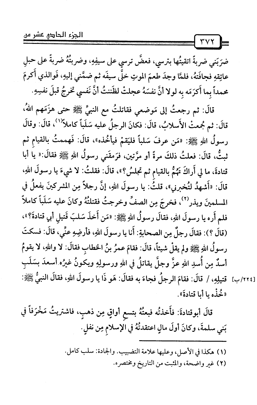 قالَ: ثم رجعتُ إلى مَوضعي فقاتلتُ مع النبيِّ صلى الله عليه وسلم حتى هزَمَهم اللهُ، قالَ: ثم جُمعتْ الأَسلابُ، قالَ: فكانَ الرجلُ عليه سَلَباً كاملاً (¬1) ، قالَ: وقالَ رسولُ اللهِ صلى الله عليه وسلم: «مَن عرفَ سَلباً فليَقمْ فيأخُذه» ، قالَ: فَهممتُ بالقيامِ ثم ثبتُّ، قالَ: فعلتُ ذلكَ مرةً أو مرَّتين، فرَمقَني رسولُ اللهِ صلى الله عليه وسلم فقالَ: «يا أبا قتادةَ، ما لي أَراكَ تَهُمُّ بالقيامِ ثم تجلسُ؟» ، قالَ: فقلتُ: لا شيءَ يا رسولَ اللهِ، قالَ: «أَشهدُ لتُخبرني» ، قلتُ: يا رسولَ اللهِ، إنَّ رجلاً مِن المشركينَ يفعلُ في المسلمينَ ويذر (¬2) ، فخرجَ مِن الصفِّ وخرجتُ فقتلتُهُ وكانَ عليه سَلَباً كاملاً فلم أَره يا رسولَ اللهِ، فقالَ رسولُ اللهِ صلى الله عليه وسلم: «مَن أَخذَ سَلبَ قَتيلِ أبي قتادةَ؟» ، (قالَ؟) : فقالَ رجلٌ مِن الصحابةِ: أَنا يا رسولَ اللهِ، فأرضِهِ عنِّي، قالَ: فسكتَ رسولُ اللهِ صلى الله عليه وسلم ولم يقلْ شيئاً، قالَ: فقامَ عمرُ بنُ الخطابِ فقالَ: لا واللهِ، لا يقومُ أسدٌ مِن أُسدِ اللهِ عزَّ وجلَّ يقاتلُ في اللهِ ورسولِهِ ويكونُ غيرُه أسعدَ بسَلَبِ قتيلِهِ، / قالَ: فقامَ الرجلُ فجاءَ به فقالَ: هَو ذَا يا رسولَ اللهِ، فقالَ النبيُّ صلى الله عليه وسلم: «خُذْه يا أبا قتادةَ» .