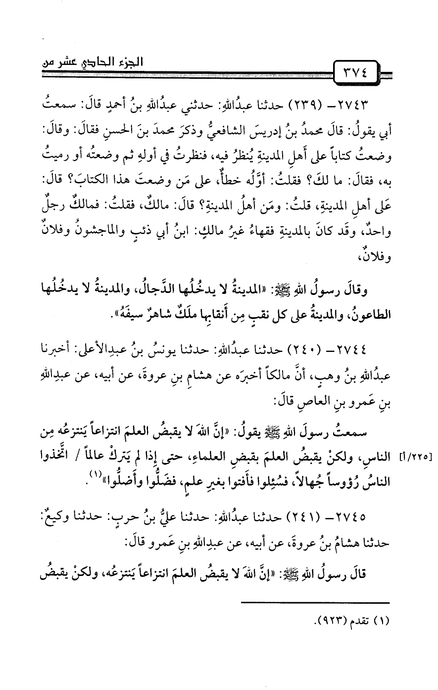 2745- (241) حدثنا عبدُاللهِ: حدثنا عليُّ بنُ حربٍ: حدثنا وكيعٌ: حدثنا هشامُ بنُ عروةَ، عن أبيه، عن عبدِاللهِ بنِ عَمرو قالَ:
