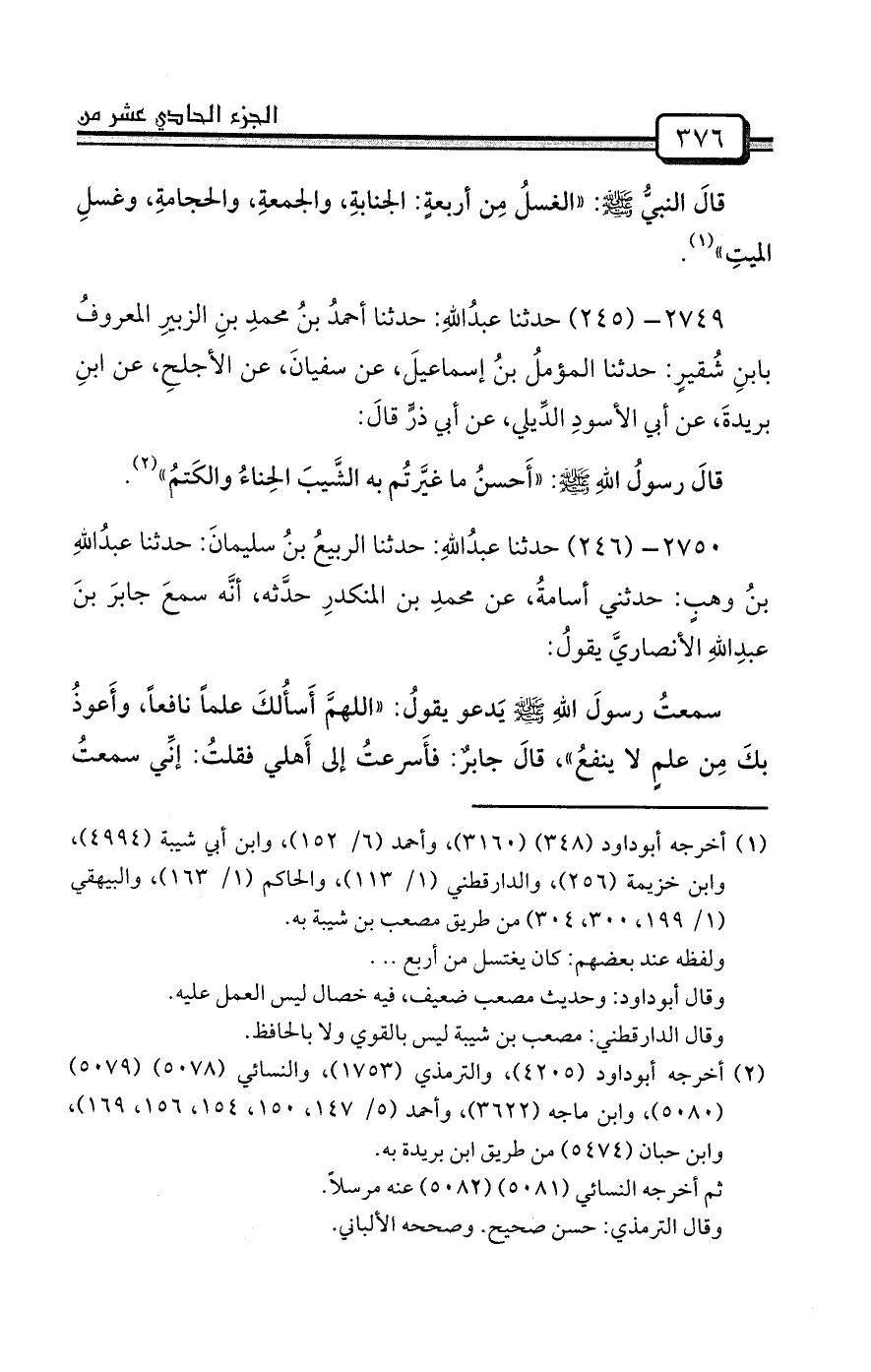 سمعتُ رسولَ اللهِ صلى الله عليه وسلم يَدعو يقولُ: «اللهمَّ أَسأُلكَ علماً نافعاً، وأَعوذُ بكَ مِن علمٍ لا ينفعُ» ، قالَ جابرٌ: فأَسرعتُ إلى أَهلي فقلتُ: إنِّي سمعتُ