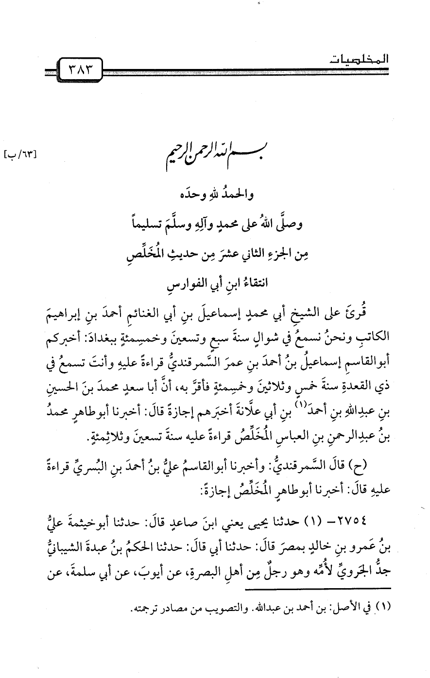 قُرئَ على الشيخِ أبي محمدٍ إسماعيلَ بنِ أبي الغنائمِ أحمدَ بنِ إبراهيمَ الكاتبِ ونحنُ نسمعُ في شوالٍ سنةَ سبعٍ وتسعينَ وخمسِمئةٍ ببغدادَ: أخبركم أبوالقاسمِ إسماعيلُ بنُ أحمدَ بنِ عمرَ السَّمرقنديُّ قراءةً عليهِ وأنتَ تسمعُ في ذي القعدةِ سنةَ خمسٍ وثلاثينَ وخمسِمئةٍ فأقرَّ به، أنَّ أبا سعدٍ محمدَ بنَ الحسينِ بنِ عبدِاللهِ بنِ أحمدَ (¬1) بنِ أبي علَّانةَ أخبَرهم إجازةً قالَ: أخبرنا أبوطاهرٍ محمدُ بنُ عبدِالرحمنِ بنِ العباسِ المُخَلِّصُ قراءةً عليه سنةَ تسعينَ وثلاثِمئةٍ.