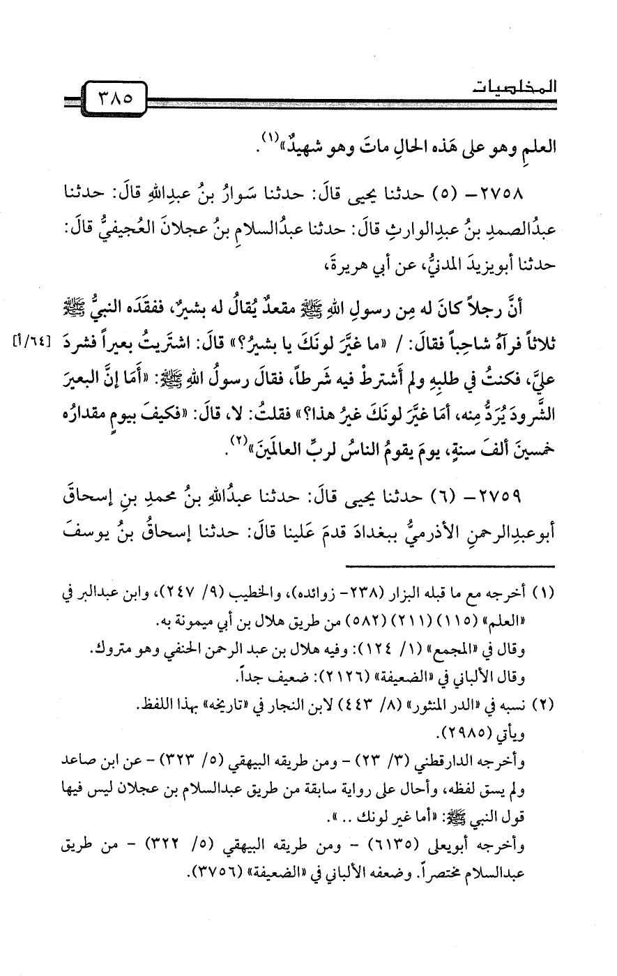 2758- (5) حدثنا يحيى قالَ: حدثنا سَوارُ بنُ عبدِاللهِ قالَ: حدثنا عبدُالصمدِ بنُ عبدِالوارثِ قالَ: حدثنا عبدُالسلامِ بنُ عجلانَ العُجيفيُّ قالَ: حدثنا أبويزيدَ المدنيُّ، عن أبي هريرةَ،