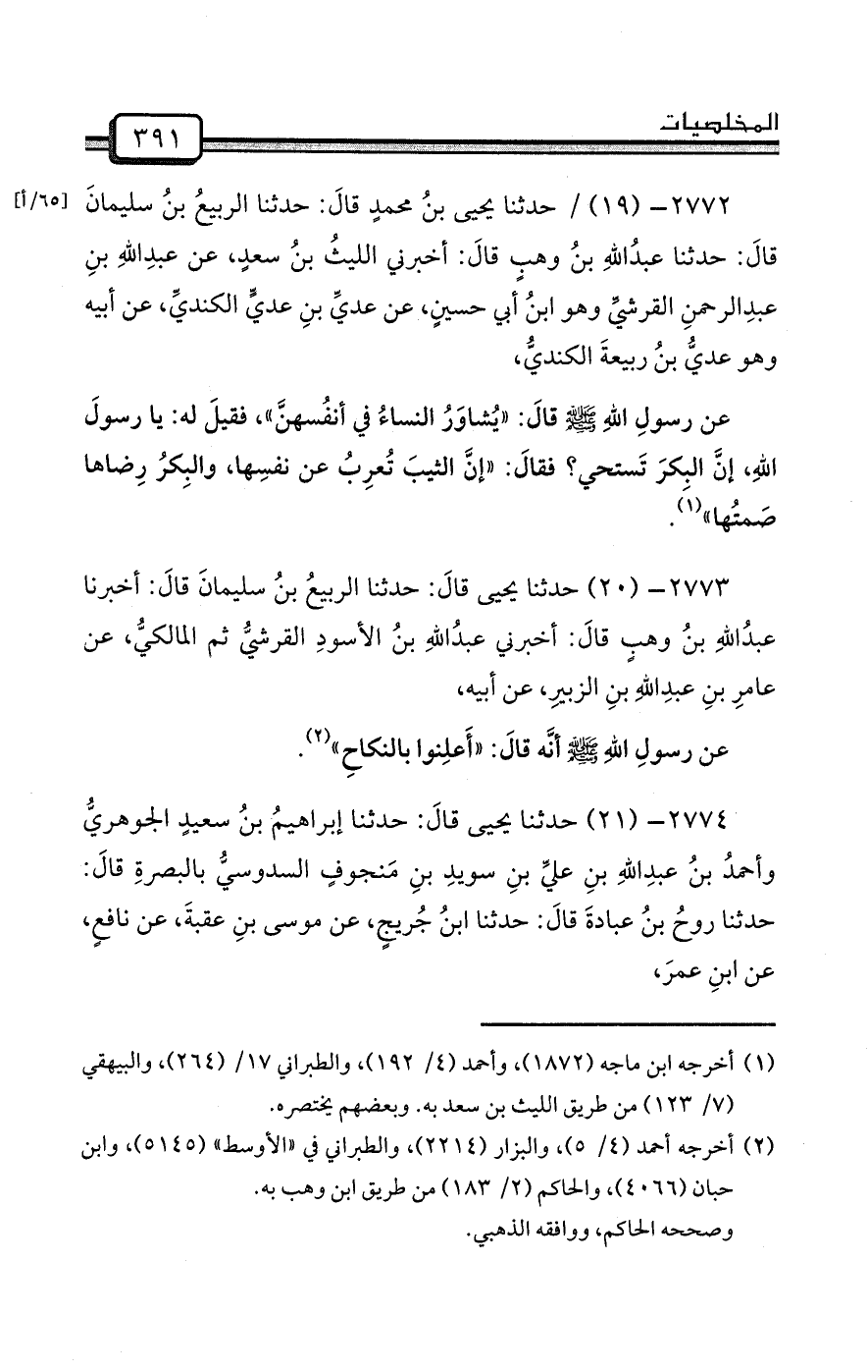 2774- (21) حدثنا يحيى قالَ: حدثنا إبراهيمُ بنُ سعيدٍ الجوهريُّ وأحمدُ بنُ عبدِاللهِ بنِ عليِّ بنِ سويدِ بنِ مَنجوفٍ السدوسيُّ بالبصرةِ قالَ: حدثنا روحُ بنُ عبادةَ قالَ: حدثنا ابنُ جُريجٍ، عن موسى بنِ عقبةَ، عن نافعٍ، عن ابنِ عمرَ،