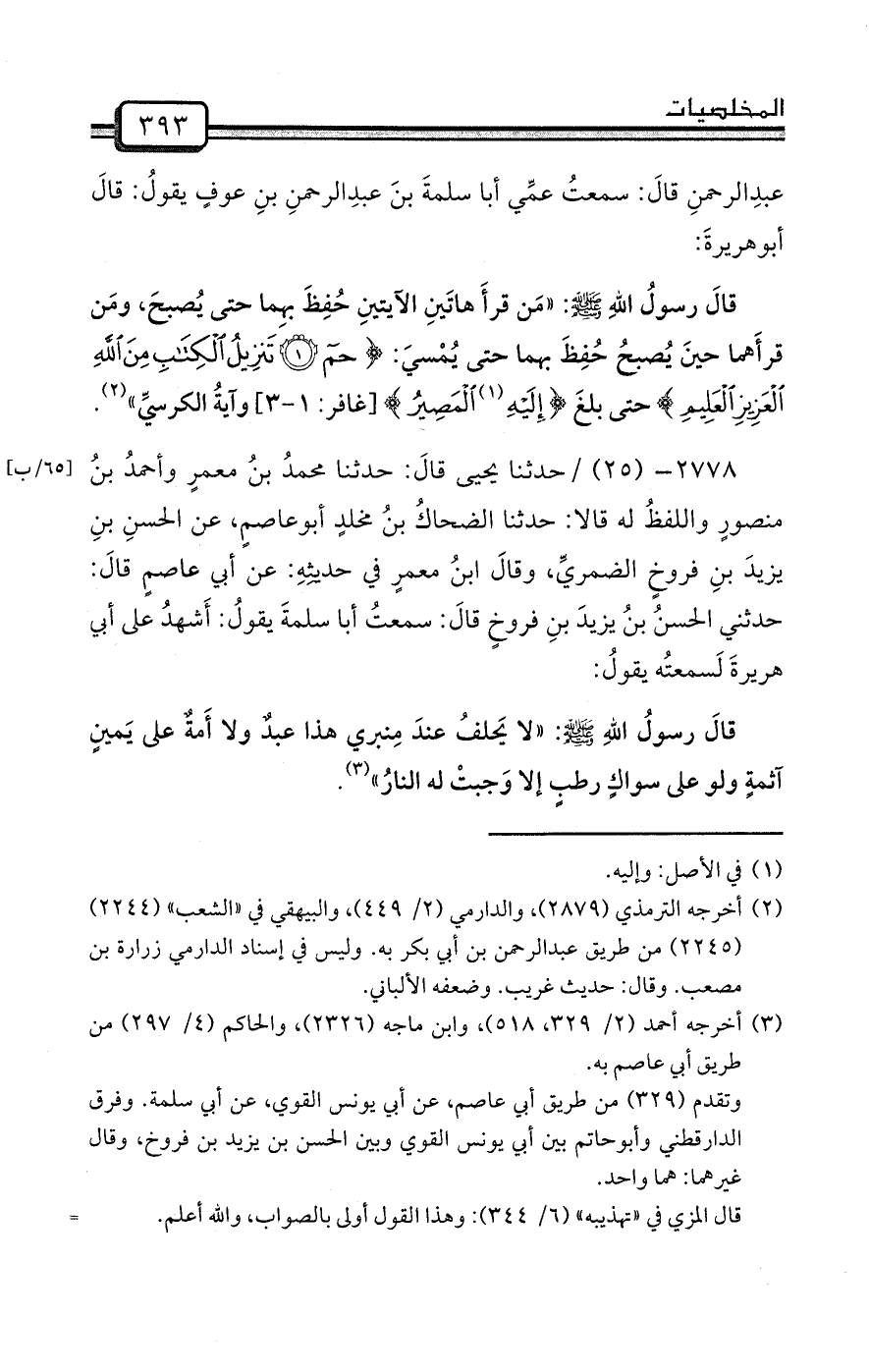 2778- (25) /حدثنا يحيى قالَ: حدثنا محمدُ بنُ معمرٍ وأحمدُ بنُ منصورٍ واللفظُ له قالا: حدثنا الضحاكُ بنُ مخلدٍ أبوعاصمٍ، عن الحسنِ بنِ يزيدَ بنِ فروخٍ الضمريِّ، وقالَ ابنُ معمرٍ في حديثِهِ: عن أبي عاصمٍ قالَ: حدثني الحسنُ بنُ يزيدَ بنِ فروخٍ قالَ: سمعتُ أبا سلمةَ يقولُ: أَشهدُ على أبي هريرةَ لَسمعتُه يقولُ: