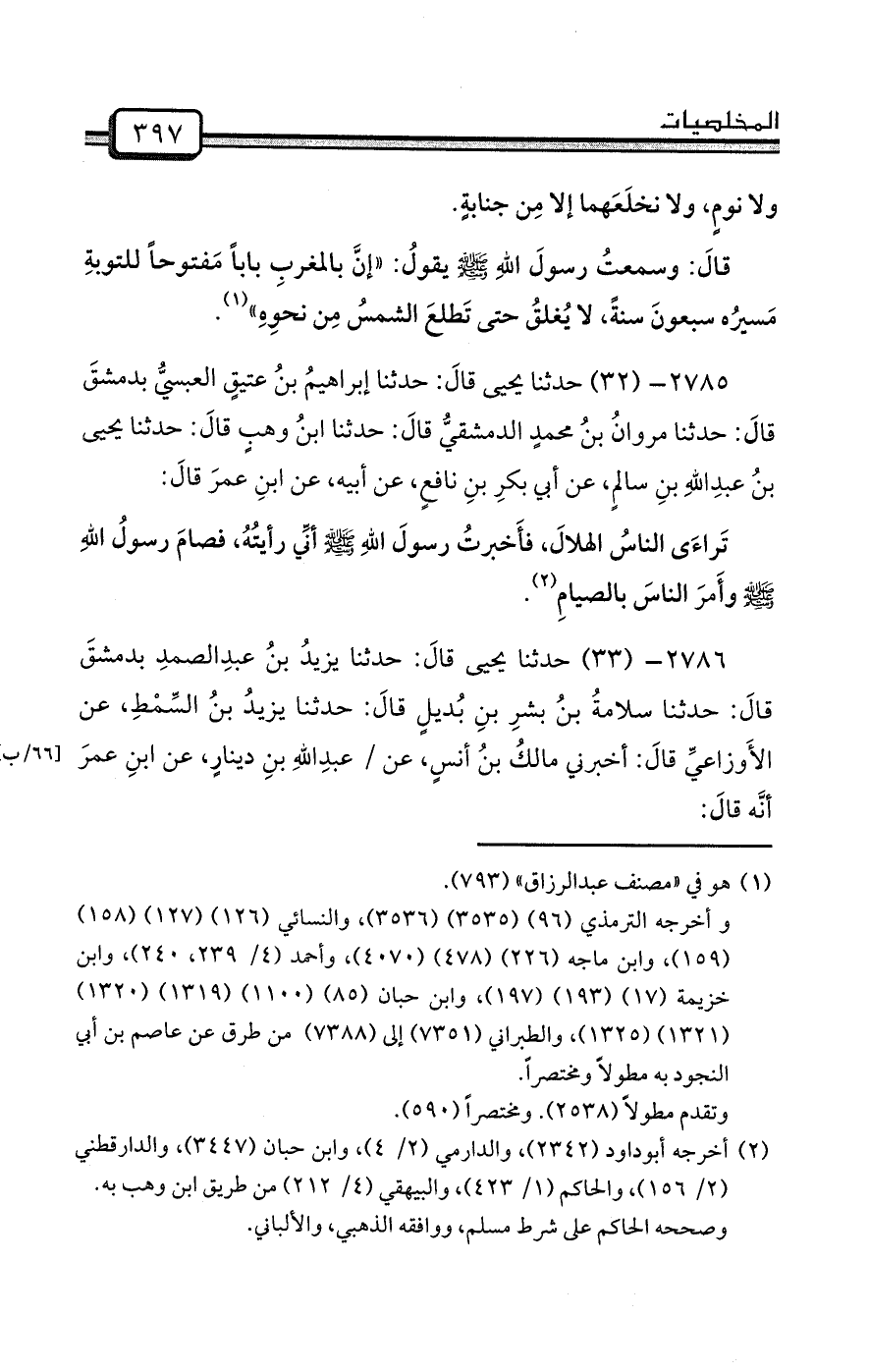 2785- (32) حدثنا يحيى قالَ: حدثنا إبراهيمُ بنُ عتيقٍ العبسيُّ بدمشقَ قالَ: حدثنا مروانُ بنُ محمدٍ الدمشقيُّ قالَ: حدثنا ابنُ وهبٍ قالَ: حدثنا يحيى بنُ عبدِاللهِ بنِ سالمٍ، عن أبي بكرِ بنِ نافعٍ، عن أبيه، عن ابنِ عمرَ قالَ: