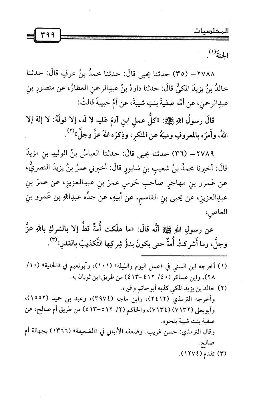 2788- (35) حدثنا يحيى قالَ: حدثنا محمدُ بنُ عوفٍ قالَ: حدثنا خالدُ بنُ يزيدَ المكيُّ قالَ: حدثنا داودُ بنُ عبدِالرحمنِ العطارُ، عن منصورِ بنِ عبدِالرحمنِ، عن أمِّه صفيةَ بنتِ شيبةَ، عن أمِّ حبيبةَ قالتْ: