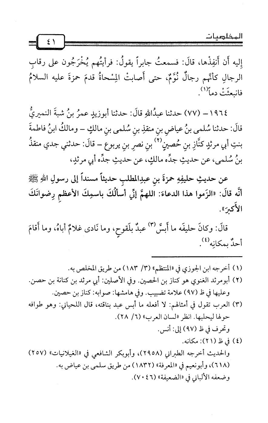 عن حديثِ حليفِهِ حمزةَ بنِ عبدِالمطلبِ حديثاً مسنداً إلى رسولِ اللهِ صلى الله عليه وسلم أنَّه قالَ: «الزَموا هذا الدعاءَ: اللهمَّ إنِّي أسألُكَ باسمِكَ الأعظمِ رِضوانَكَ الأَكبرَ» .