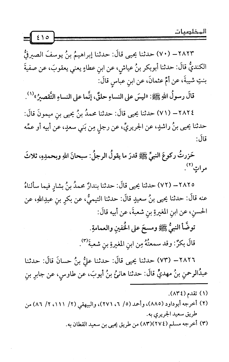 2826- (73) حدثنا يحيى قالَ: حدثنا عليُّ بنُ حسانَ قالَ: حدثنا عبدُالرحمنِ بنُ مهديٍّ قالَ: حدثنا هانئُ بنُ أيوبَ، عن طاوسٍ، عن جابرِ بنِ