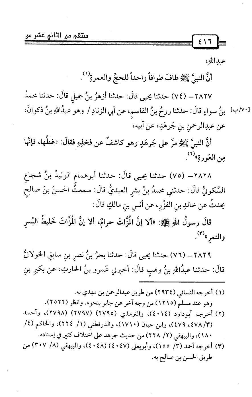 2827- (74) حدثنا يحيى قالَ: حدثنا أزهرُ بنُ جميلٍ قالَ: حدثنا محمدُ بنُ سواءٍ قالَ: حدثنا روحُ بنُ القاسمِ، عن أبي الزنادِ / وهو عبدُاللهِ بنُ ذكوانَ، عن عبدِالرحمنِ بنِ جَرهَدٍ، عن أبيه،