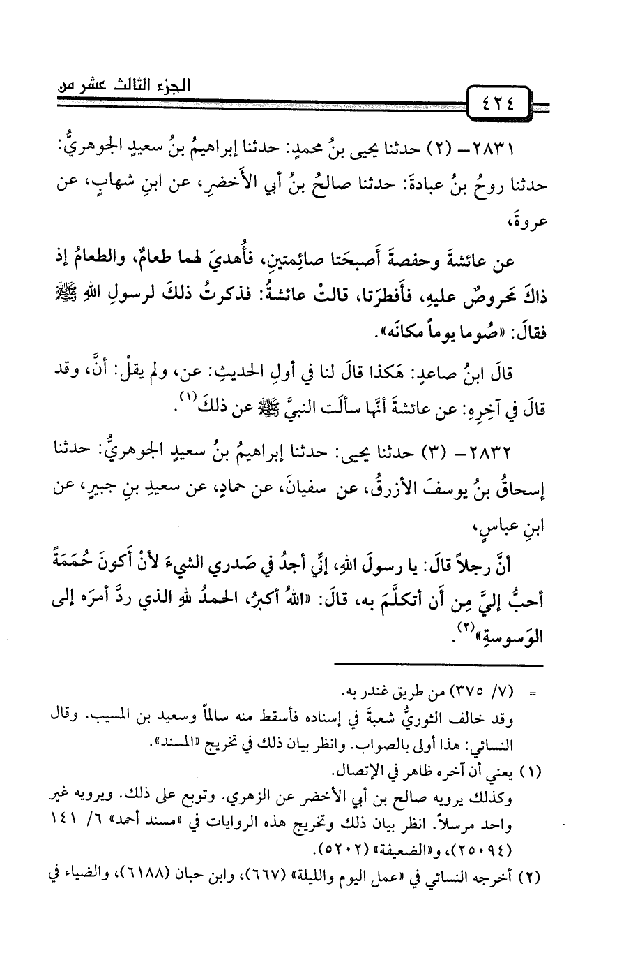 2831- (2) حدثنا يحيى بنُ محمدٍ: حدثنا إبراهيمُ بنُ سعيدٍ الجوهريُّ: حدثنا روحُ بنُ عبادةَ: حدثنا صالحُ بنُ أبي الأَخضرِ، عن ابنِ شهابٍ، عن عروةَ،