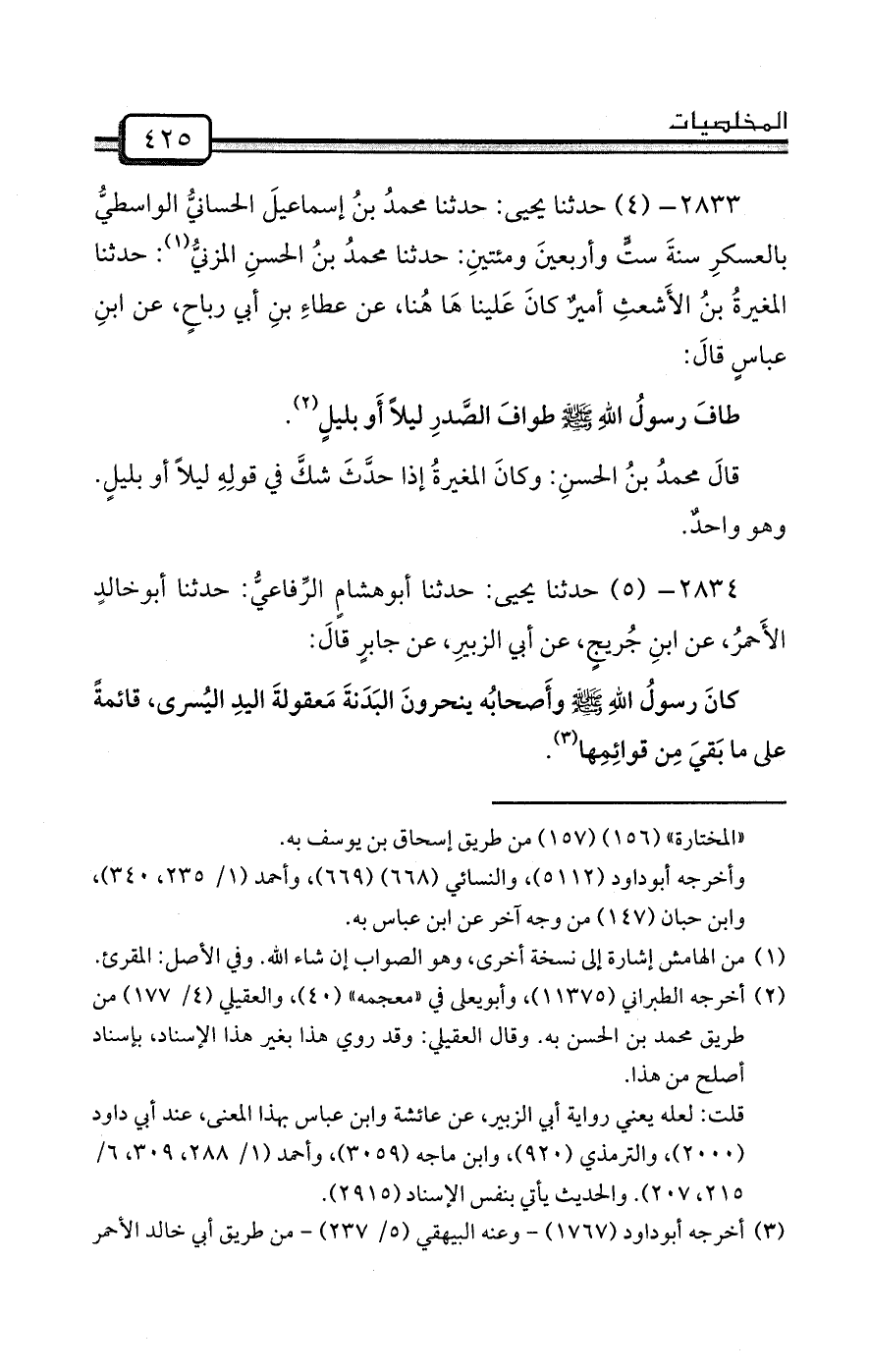 2833- (4) حدثنا يحيى: حدثنا محمدُ بنُ إسماعيلَ الحسانيُّ الواسطيُّ بالعسكرِ سنةَ ستٍّ وأربعينَ ومئتينِ: حدثنا محمدُ بنُ الحسنِ المزنيُّ (¬1) : حدثنا المغيرةُ بنُ الأَشعثِ أميرٌ كانَ عَلينا هَا هُنا، عن عطاءِ بنِ أبي رباحٍ، عن ابنِ عباسٍ قالَ: