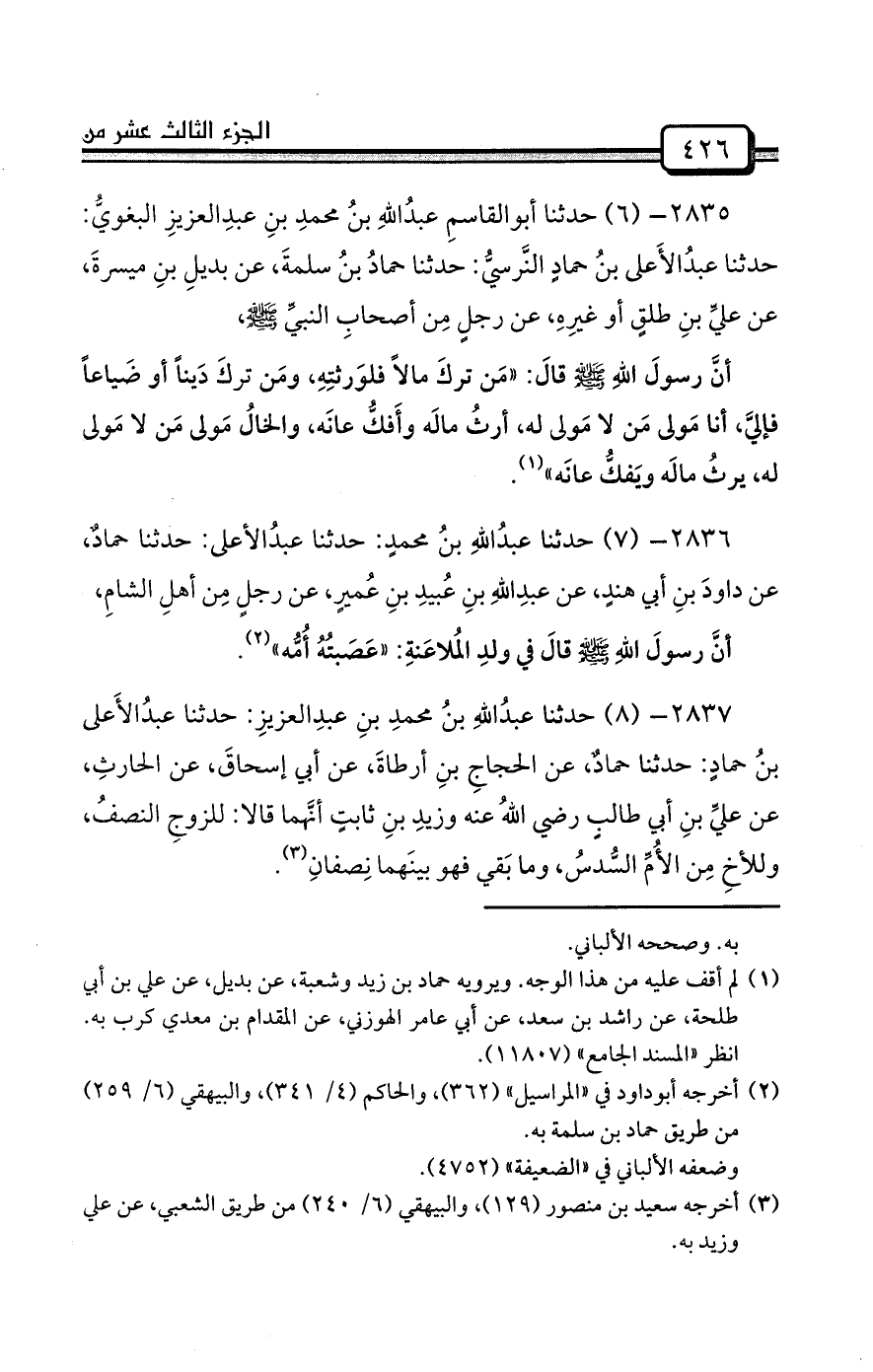 2837- (8) حدثنا عبدُاللهِ بنُ محمدِ بنِ عبدِالعزيزِ: حدثنا عبدُالأَعلى بنُ حمادٍ: حدثنا حمادٌ، عن الحجاجِ بنِ أرطاةَ، عن أبي إسحاقَ، عن الحارثِ، عن عليِّ بنِ أبي طالبٍ رضي اللهُ عنه وزيدِ بنِ ثابتٍ أنَّهما قالا: للزوجِ النصفُ، وللأخِ مِن الأُمِّ السُّدسُ، وما بَقي فهو بينَهما نِصفانِ (¬3) .