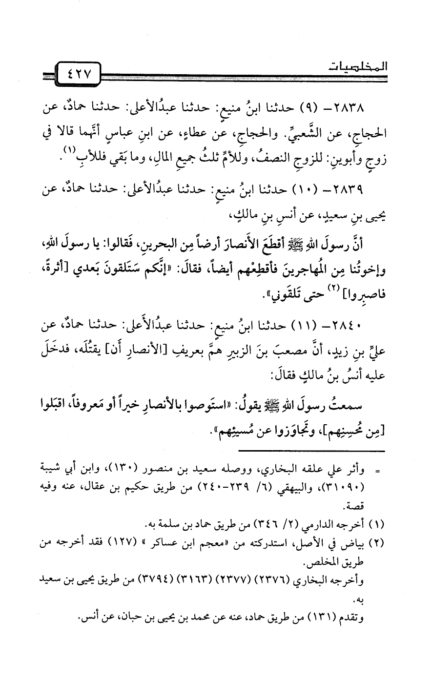 2839- (10) حدثنا ابنُ منيعٍ: حدثنا عبدُالأعلى: حدثنا حمادٌ، عن يحيى بنِ سعيدٍ، عن أنسِ بنِ مالكٍ،