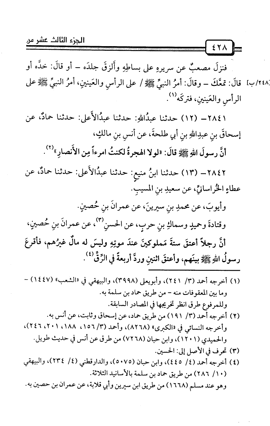2841- (12) حدثنا عبدُاللهِ: حدثنا عبدُالأَعلى: حدثنا حمادٌ، عن إسحاقَ بنِ عبدِاللهِ بنِ أبي طلحةَ، عن أنسِ بنِ مالكٍ،