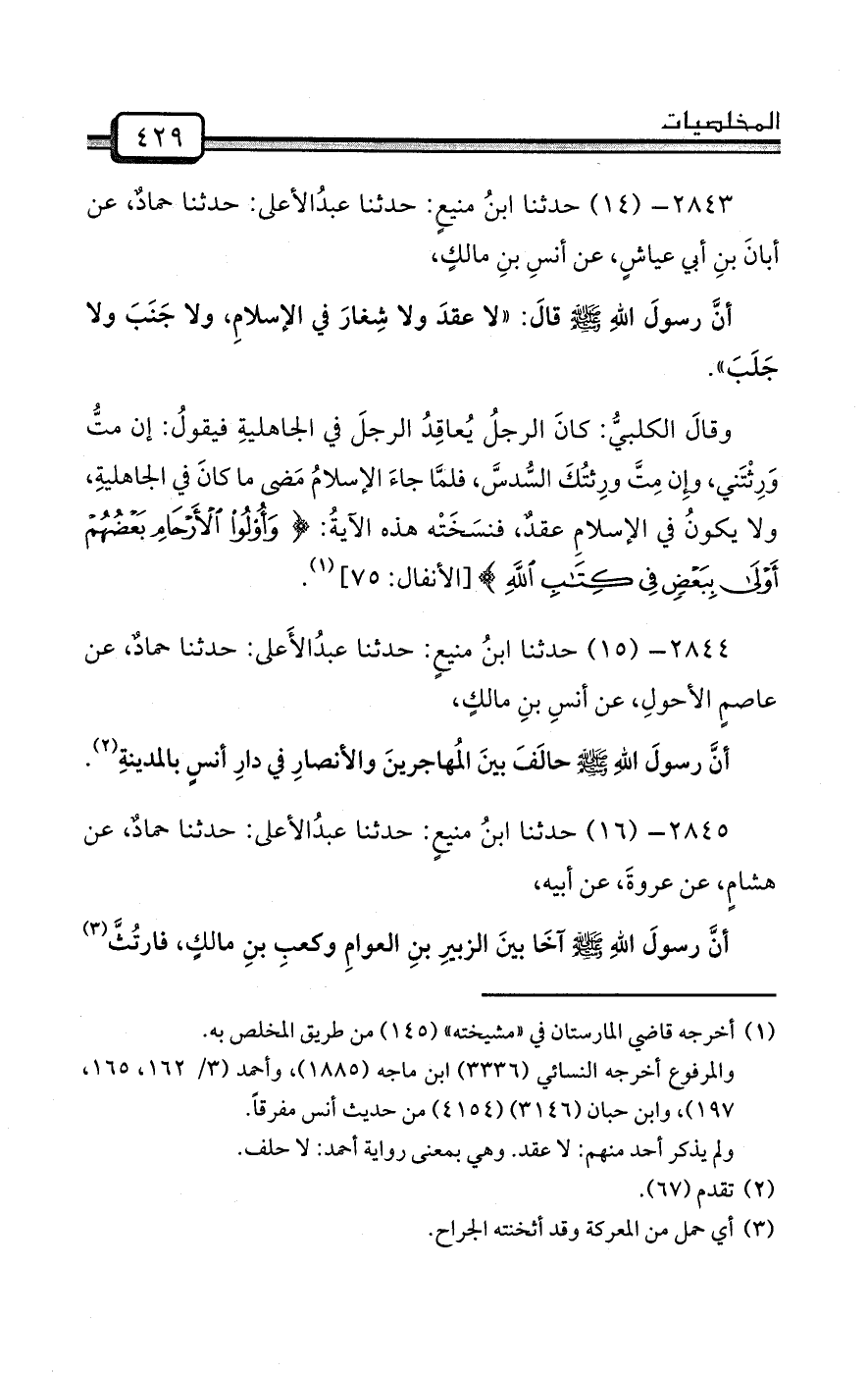 2843- (14) حدثنا ابنُ منيعٍ: حدثنا عبدُالأعلى: حدثنا حمادٌ، عن أبانَ بنِ أبي عياشٍ، عن أنسِ بنِ مالكٍ،