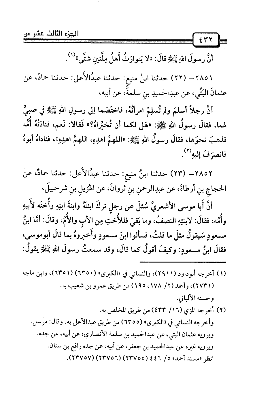 2852- (23) حدثنا ابنُ منيعٍ: حدثنا عبدُالأَعلى: حدثنا حمادٌ، عن الحجاجِ بنِ أرطاةَ، عن عبدِالرحمنِ بنِ ثروانَ، عن الهُزيلِ بنِ شرحبيلَ،
