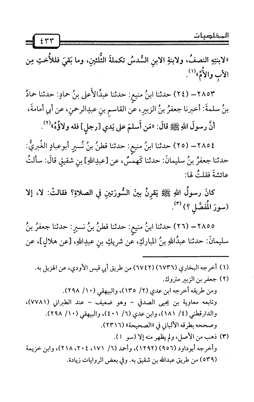 2853- (24) حدثنا ابنُ منيعٍ: حدثنا عبدُالأَعلى بنُ حمادٍ: حدثنا حمادُ بنُ سلمةَ: أخبرنا جعفرُ بنُ الزبيرِ، عن القاسمِ بنِ عبدِالرحمنِ، عن أبي أمامةَ،