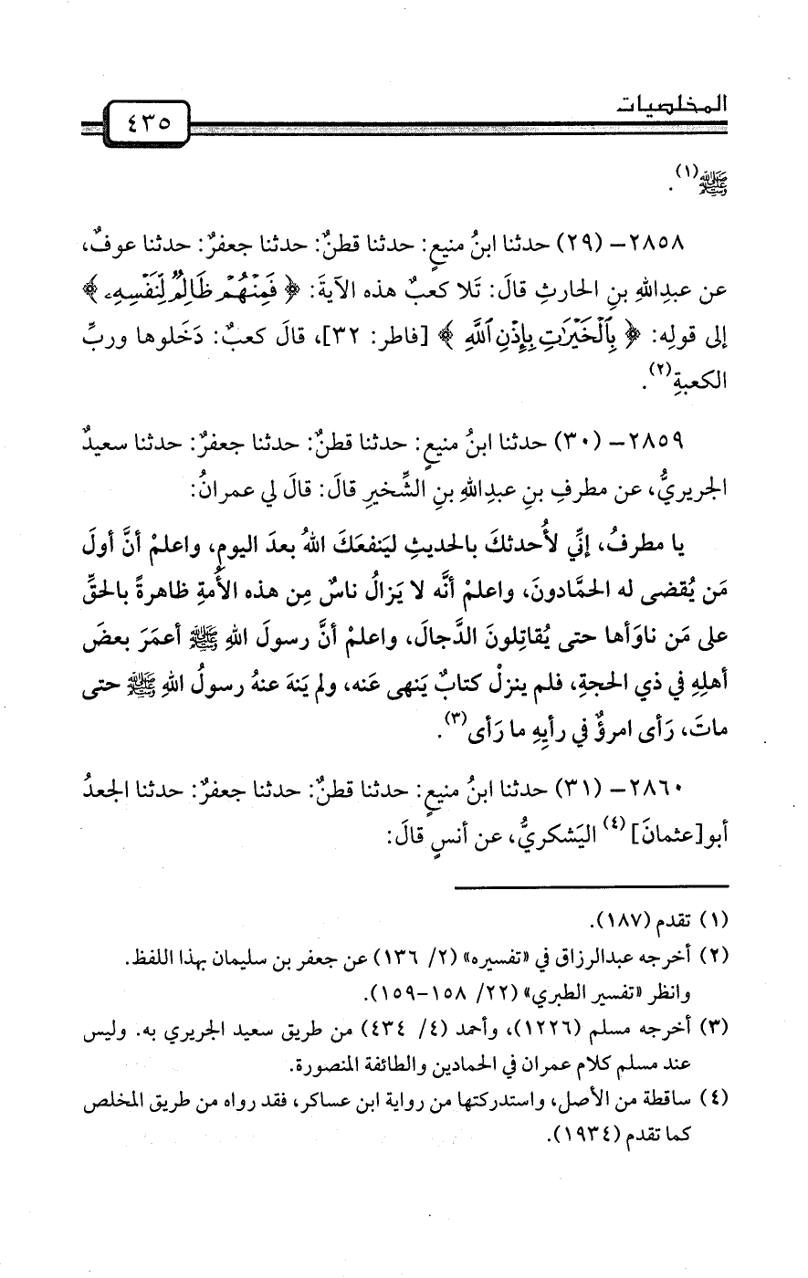 2859- (30) حدثنا ابنُ منيعٍ: حدثنا قطنٌ: حدثنا جعفرٌ: حدثنا سعيدٌ الجريريُّ، عن مطرفِ بنِ عبدِاللهِ بنِ الشِّخيرِ قالَ: قالَ لي عمرانُ: