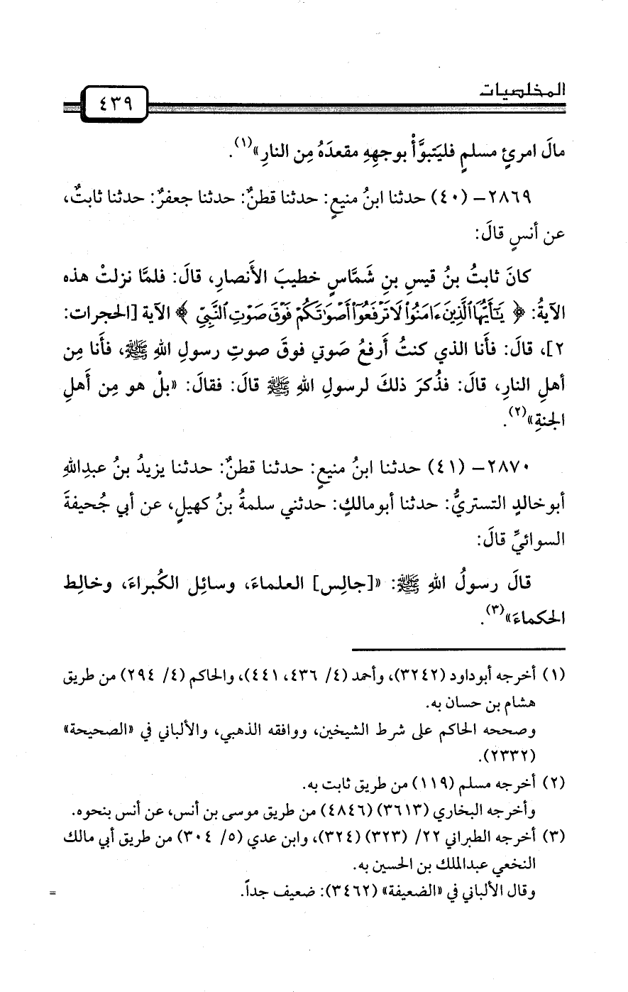 2869- (40) حدثنا ابنُ منيعٍ: حدثنا قطنٌ: حدثنا جعفرٌ: حدثنا ثابتٌ، عن أنسٍ قالَ: