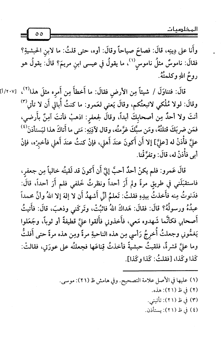 قالَ: فتناوَلَ / شيئاً مِن الأرضِ فقالَ: ما أَخطأَ مِن أَمرِه مثلَ هذا (¬2) ، وقالَ: لولا مُلْكي لاتبعتُكم، وقالَ يَعني لعَمرو: ما كنتُ أُبالي أَن لا تأتي (¬3) أنتَ ولا أحدٌ مِن أصحابِكَ أبداً، وقالَ لجعفرٍ: اذهبْ فأنتَ آمِنٌ بأَرضي، فمَن ضربَكَ قتلتُهُ، ومَن سبَّكَ غرَّمتُه، وقال لآذِنِهِ: مَتى ما أَتاكَ هذا ليَستأذنَ (¬4) عليَّ فأْذنْ له [عليَّ] إلا أَن أَكونَ عندَ أَهلي، فإنْ كنتُ عندَ أَهلي فأخبِرْه، فإنْ أبى فأْذنْ له، قالَ: وتفرَّقْنا.