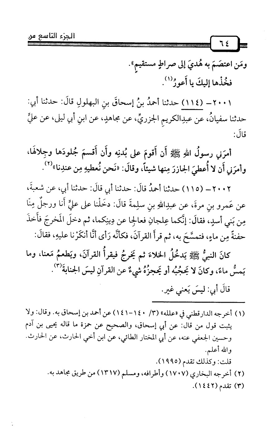 2002- (115) حدثنا أحمدُ قالَ: حدثنا أبي قالَ: حدثنا أبي، عن شعبةَ، عن عَمرو بنِ مرةَ، عن عبدِاللهِ بنِ سلِمةَ قالَ: دخَلْنا على عليٍّ أَنا ورجلٌ مِنّا مِن بَني أسدٍ، فقالَ: إنَّكما عِلجانِ فعالِجا عن دِينِكما، ثم دخلَ المَخرجَ فأَخذَ حفنةً مِن ماءٍ، فتمسَّحَ به، ثم قرأَ القرآنَ، فكأنَّه رَأى أنَّا أنكَرْنا عليهِ، فقالَ: