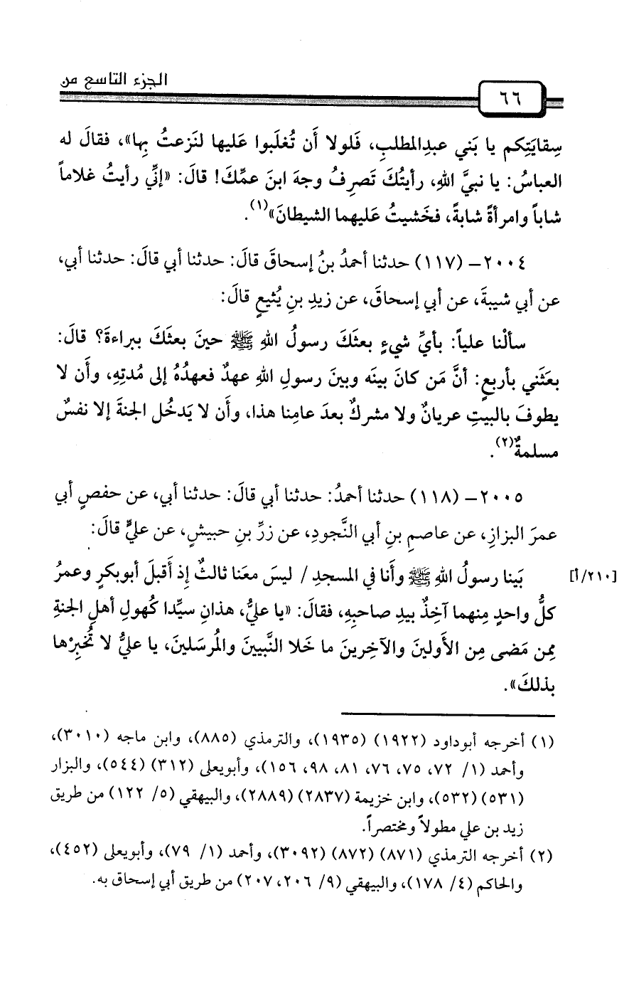 2005- (118) حدثنا أحمدُ: حدثنا أبي قالَ: حدثنا أبي، عن حفصٍ أبي عمرَ البزازِ، عن عاصمِ بنِ أبي النَّجودِ، عن زرِّ بنِ حبيشٍ، عن عليٍّ قالَ: