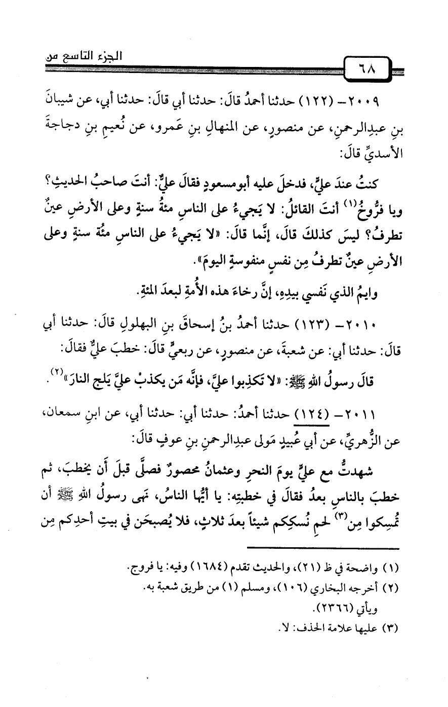 2009- (122) حدثنا أحمدُ قالَ: حدثنا أبي قالَ: حدثنا أبي، عن شيبانَ بنِ عبدِالرحمنِ، عن منصورٍ، عن المنهالِ بنِ عَمرو، عن نُعيمِ بنِ دجاجةَ الأسديِّ قالَ: