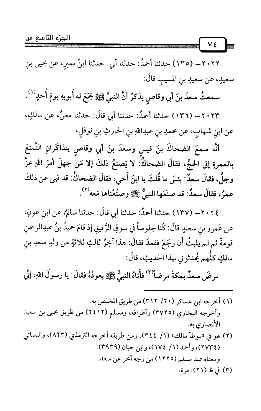 2022- (135) حدثنا أحمدُ: حدثنا أبي: حدثنا ابنُ نميرٍ، عن يحيى بنِ سعيدٍ، عن سعيدِ بنِ المسيبِ قالَ: