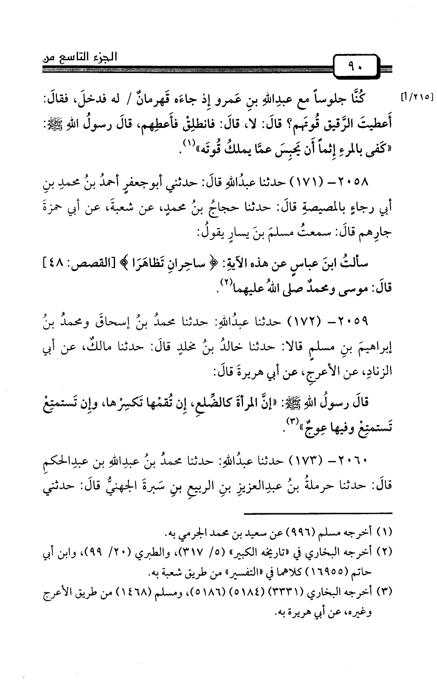 كُنَّا جلوساً مع عبدِاللهِ بنِ عَمرو إِذ جاءَه قَهرمانٌ / له فدخلَ، فقالَ: أَعطيتَ الرَّقيق قُوتَهم؟ قالَ: لا، قالَ: فانطلِقْ فأَعطِهم، قالَ رسولُ اللهِ صلى الله عليه وسلم: «كَفى بالمرءِ إِثماً أَن يَحبِسَ عمَّا يملكُ قُوتَه» (¬1) .