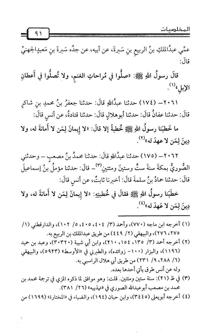ما خَطبَنا رسولُ اللهِ صلى الله عليه وسلم خُطبةً إلا قالَ: «لا إِيمانَ لِمَن لا أَمانةَ له، ولا دِينَ لِمَن لا عهدَ له» (¬2) .