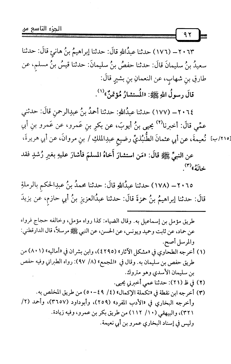 2064- (177) حدثنا عبدُاللهِ: حدثنا أحمدُ بنُ عبدِالرحمنِ قالَ: حدثني عمِّي قالَ: أخبرنا (¬2) يحيى بنُ أيوبَ، عن بكرِ بنِ عَمرو، عن عَمرو بنِ أبي نُعيمةَ، عن أبي عثمانَ الطُّنبُذيِّ رضيعِ عبدِالملكِ / بنِ مروانَ، عن أبي هريرةَ،