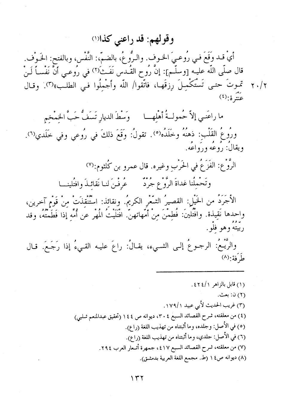 والرَّيْعُ: الرجوع إلى الشيء، يقال: راع عليه القيءُ إذا رجع. قال طرفة: