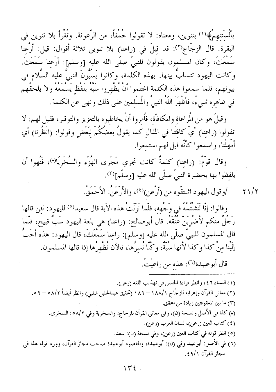 وقيل هو من المراعاة والمكافأة، فأمروا أن يخاطبوه بالتعزيز والتوقير، فقيل لهم: لا تقولوا (راعنا) أي كافئنا في المقال كما يقول بعضكم لبعض وقولوا: (انظرنا) أي أمهلنا، واسمعوا كأنه قيل لهم استمعوا.