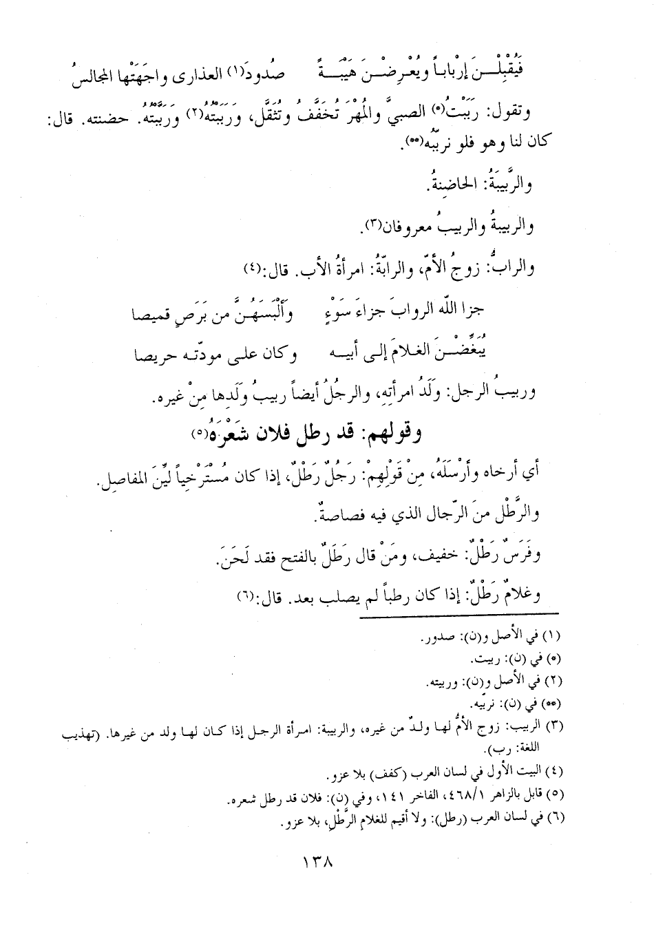 وتقول: رببتُ الصبي والمُهْرَ تخففُ وتُثَقَّل ورببتُهُ ورببْتُهُ. حضنته. قال: كان لنا وهو فلو نرببُه.
