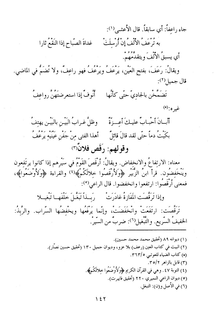معناه: الارتفاعُ والانخفاض. ويقالُ: أرْقَصَ القوْمُ في سيرهم إذا كانوا يرتفعون وينخفضون. قرأ ابن الزبير {ولأرْقَصُوا خِلالَكُمْ} والقراءة {وَلأَوْضَعُوا}، فمعنى أرقصوا: ارتفعوا وانخفضوا. قال الراعي: