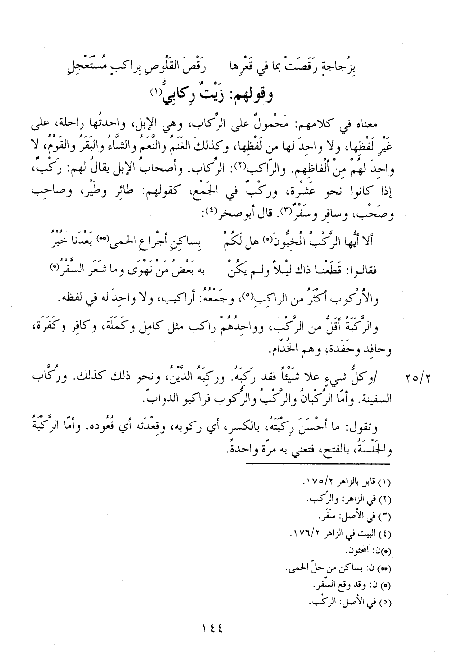 معناه في كلامهم: محمولٌ على الركاب، وهي الإبل، واحدتها راحلة، على غير لفظها، ولا واحد لها من لفظها، وكذلك الغنمُ والنَّعَمُ والشَّاءُ والبقرُ والقومُ، لا واحد لهم من ألفاظهم. والراكب: الركاب. وأصحاب الإبل يقال لهم: ركبٌ، إذا كانوا نحو عشرة، وركبٌ في الجمع، كقولهم: طائِر وطَيْر، وصاحب وصحْب، وسافِر وسَفْرٌ. قال أبو صخر: