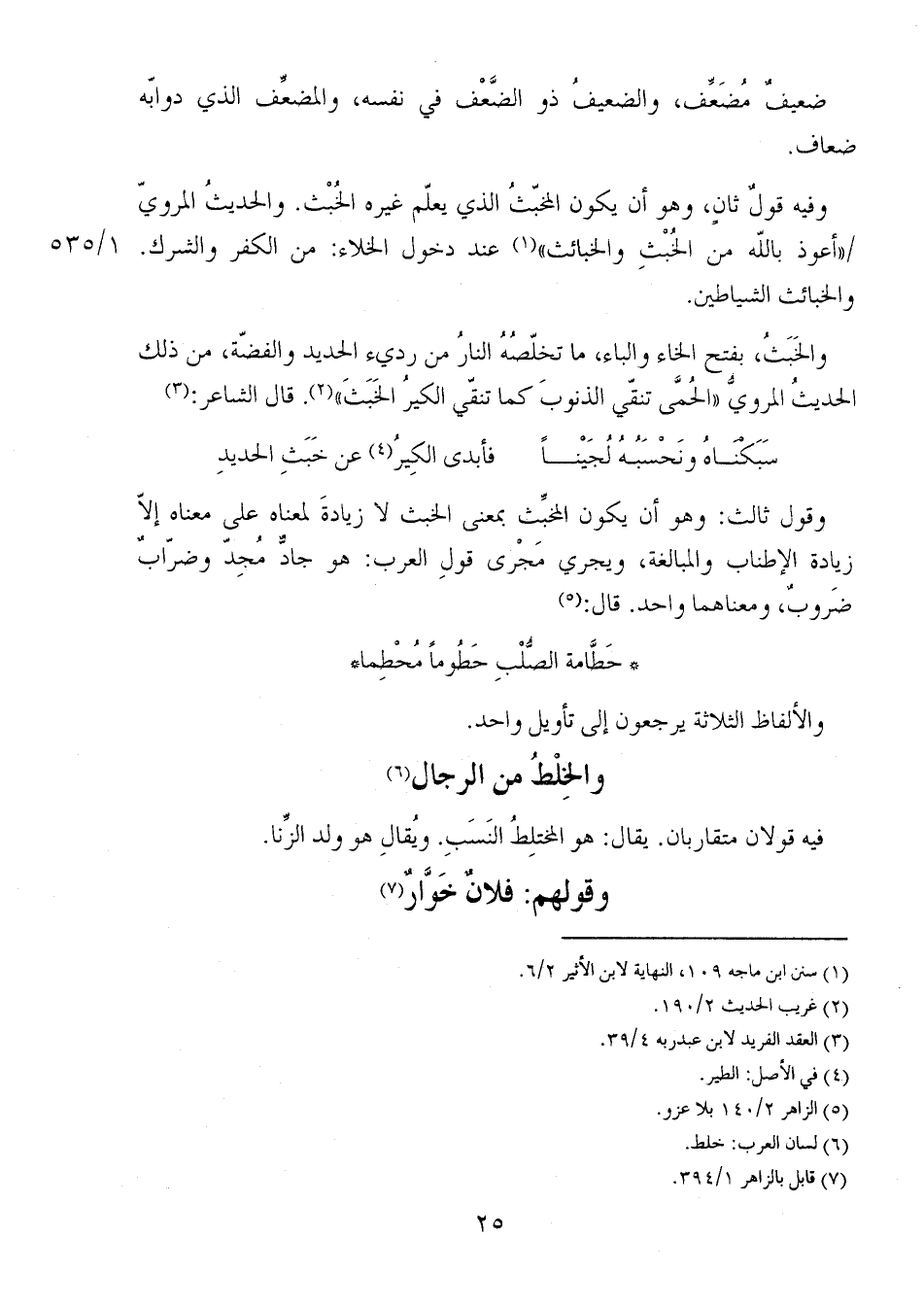 وفيه قولٌ ثانٍ، وهو أن يكون المخبثُ الذي يعلم غيره الخُبْث. والحديثُ المروي 1/ 535 "أعوذ بالله من الخُبْثِ والخبائث" عند دخول الخلاء: من الكفر والشرك. والخبائث الشياطين.