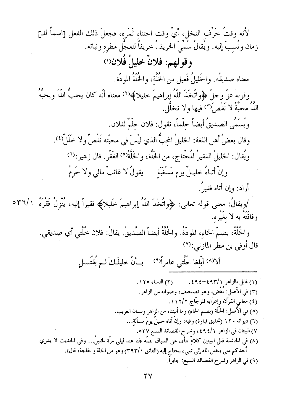 وقال بعض أهل اللغة: الخليل المحِبُّ الذي ليس في محبته نقصٌ ولا خللٌ.