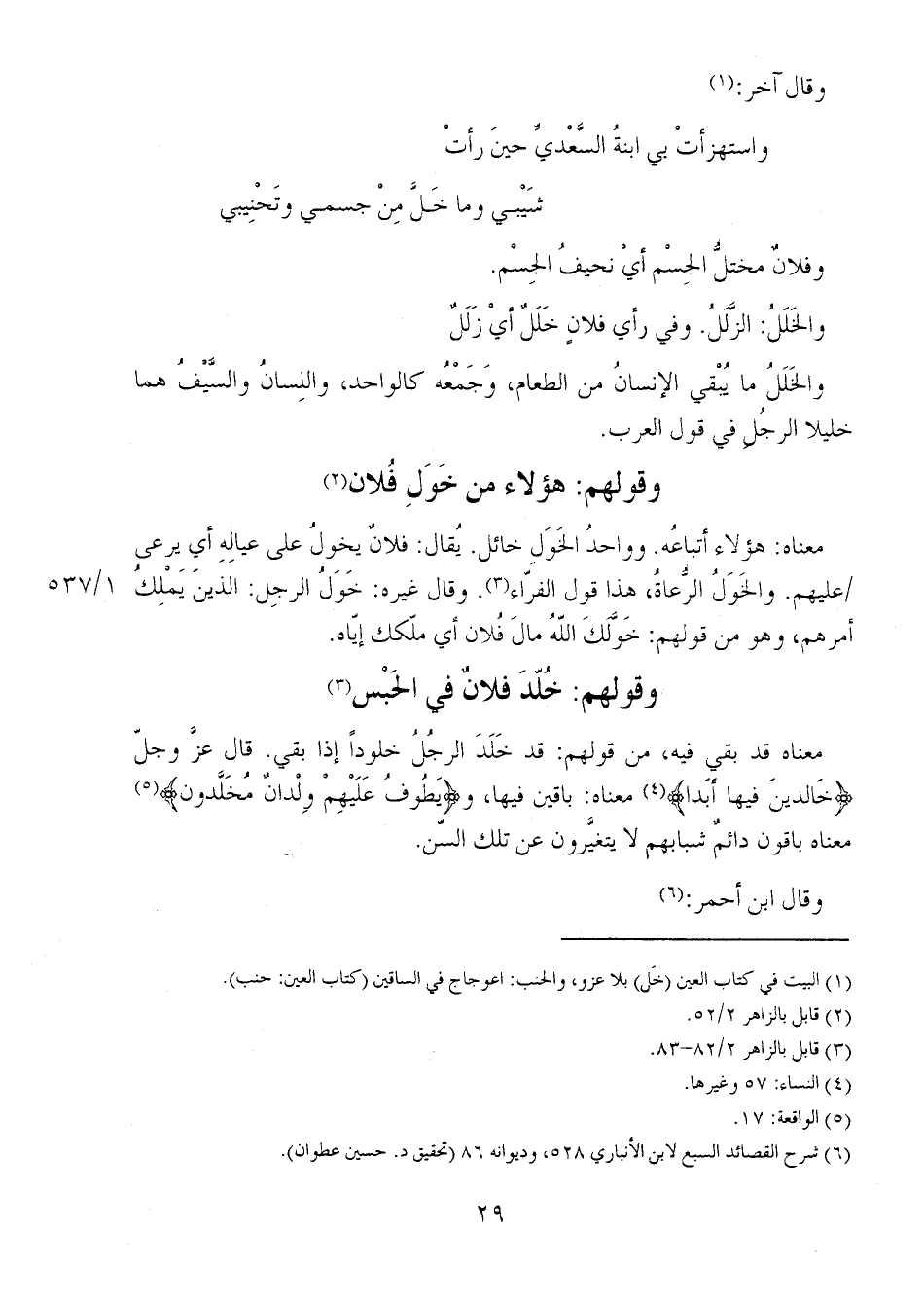 معناه: هؤلاء أتباعه. وواحدُ الخول خائل. يقال: فلانٌ يخولُ على عياله أي يرعى 1/ 537 عليهم. والخَوَلُ الرُّعاةُ، هذا قول الفراء. وقال غيره: خولُ الرجل: الذين يملكُ أمرهم، وهو من قولهم: خَوَّلَكَ اللهُ مال فلان أي ملكك إياه.