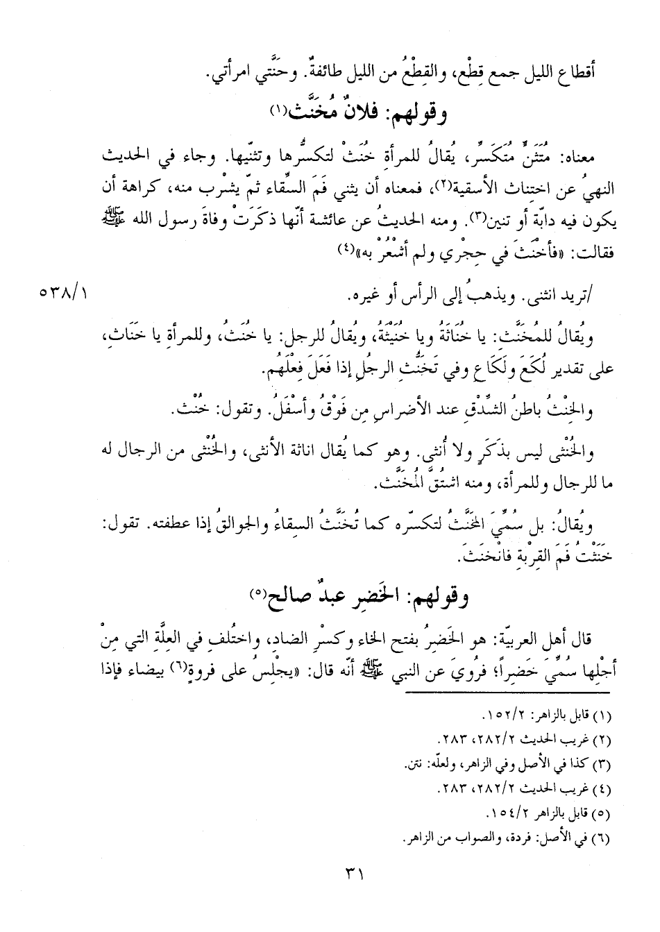 والخُنْثى ليس بذكرٍ ولا أنثى. وهو كما يُقال إناثة الأنثى، والخُنْثى من الرجال له ما للرجال وللمرأة، ومنه اشتُقَّ المُخَنَّث.